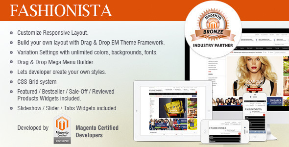 EM Fashionista is a multi-purpose Responsive Magento Theme with powerful Theme Framework built-in lets you develop your own layouts, create your own color variants, fonts and more with non-technical knowledge needed.